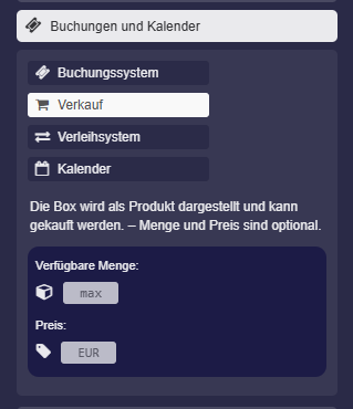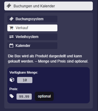 Klicken Sie in den Box-Einstellungen auf „Kalender und Buchungen“. Dort aktivieren Sie die Option „Verkauf“: