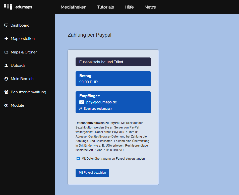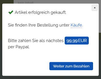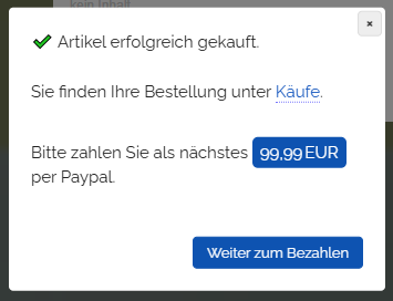 Der Benutzer kann nun „Weiter zum Bezahlen“ klicken, sofern ein Preis angegeben wurde, und dort per PayPal bezahlen.